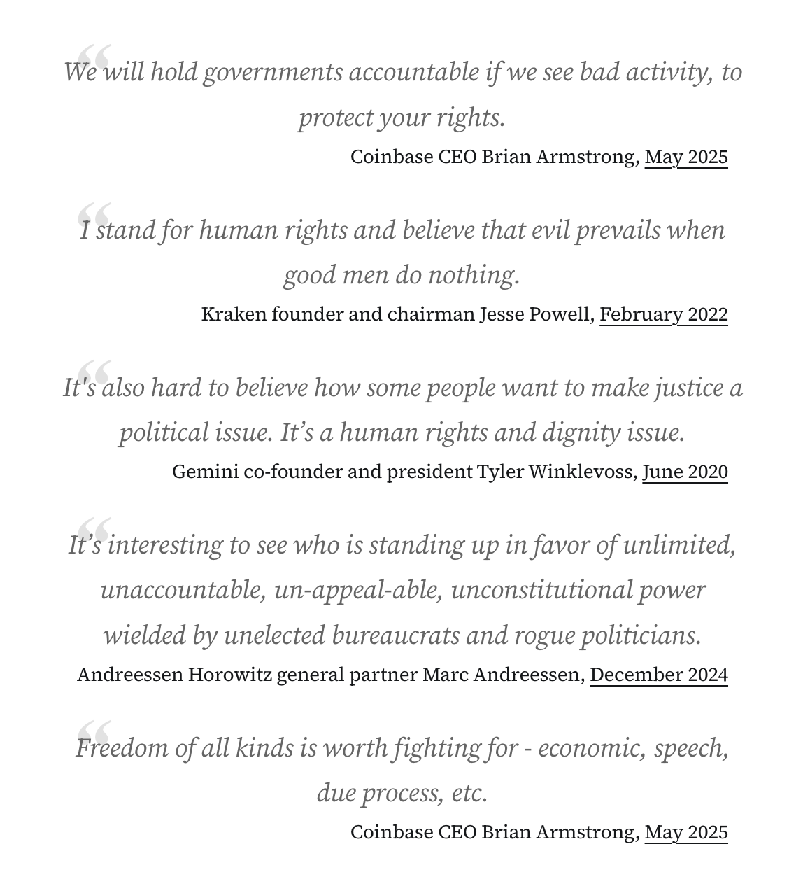 in reply to Molly White • • •For years, crypto executives have touted cryptocurrency’s supposed anti-authoritarian and human rights credentials. But where are they when their beloved president claims Alex Pretti’s lawful gun ownership justified his killing, or when ICE leaders tell subordinates to enter homes without warrants?