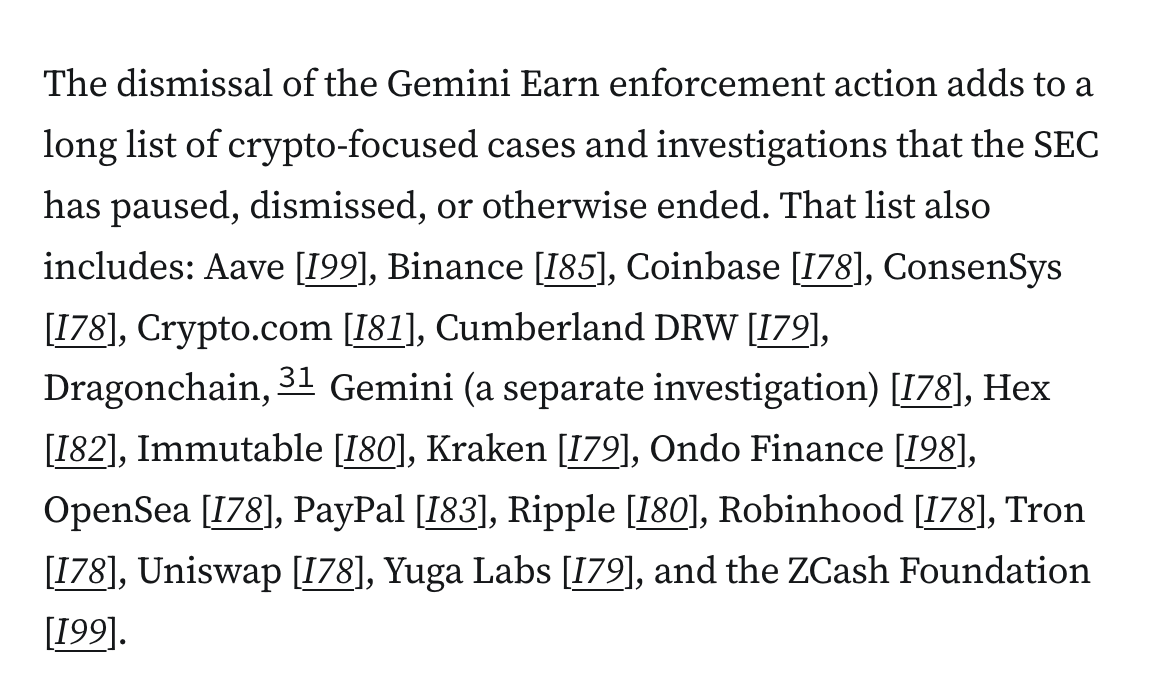 To date, the SEC has paused, dismissed, or otherwise ended crypto lawsuits or investigations against Aave, Binance, Coinbase, ConsenSys, Crypto.com, Cumberland DRW, Dragonchain, Gemini (twice), Hex, Immutable, Kraken, Ondoe, OpenSea, PayPal, Ripple, Robinhood, Tron, Uniswap, Yuga Labs, and Zcash.