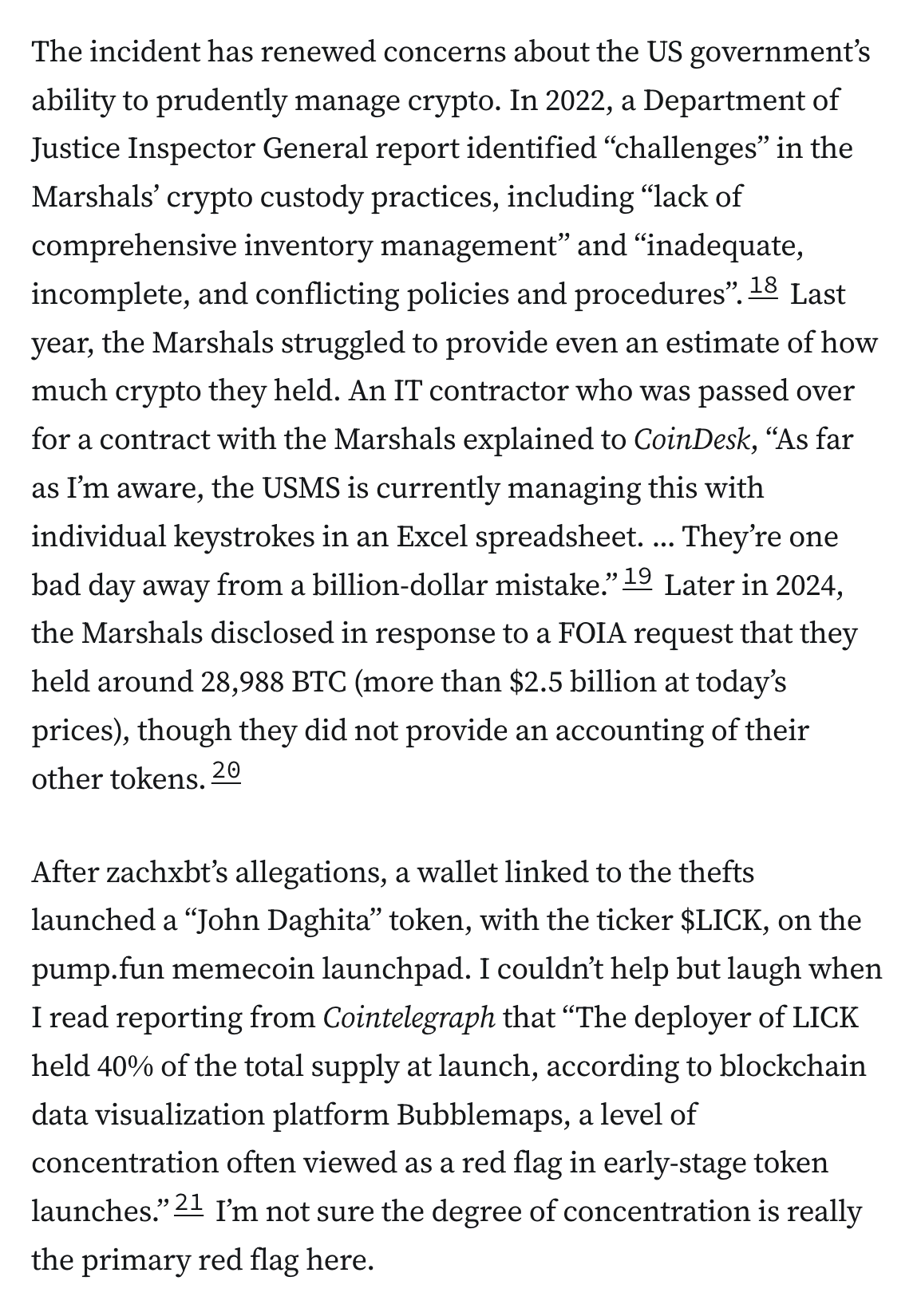in reply to Molly White • • •$40 million in seized crypto held by the US Marshals was stolen in 2024, and crypto sleuth zachxbt has now linked the thefts to the son of a contractor managing the agency's crypto assets. The incident has renewed concerns about the government's ability to manage its crypto holdings.