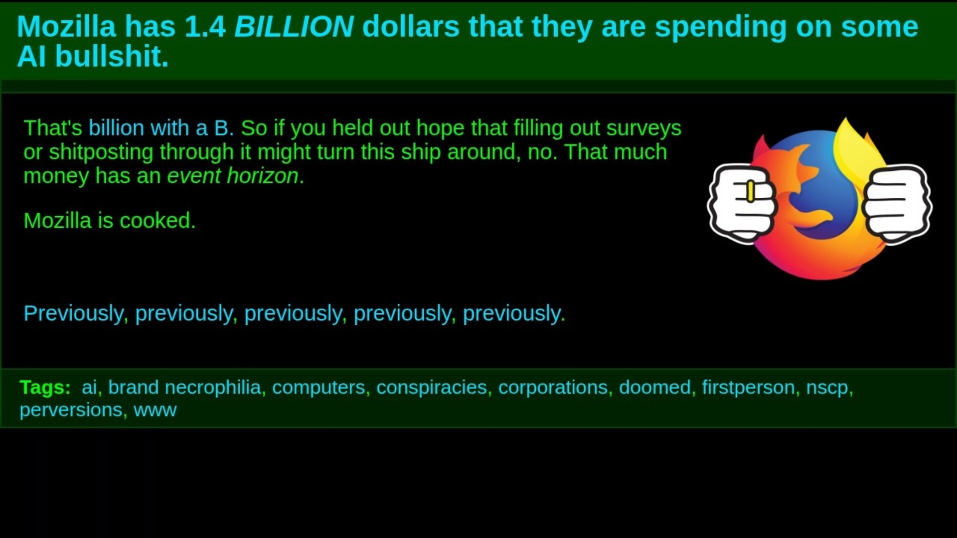 Mozilla has 1.4 BILLION dollars that they are spending on some AI bullshit.