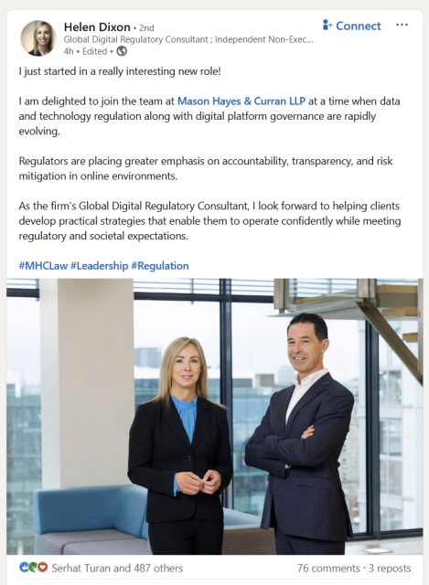 😵 🤯 Last year a #Meta Lobbyist became a new head of the #Irish Data Protection Commission (DPC). Today, the former head of the DPC announced that she is now working for MHC - the Irish law firm for Meta that was previously defending Meta before the #DPC in #GPDR cases - basically a 360° seat swap between the Irish regulator and Meta.