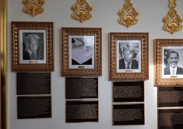 Today, news broke that Trump has added plaques to the hall of portraits of former presidents hanging in the White House."