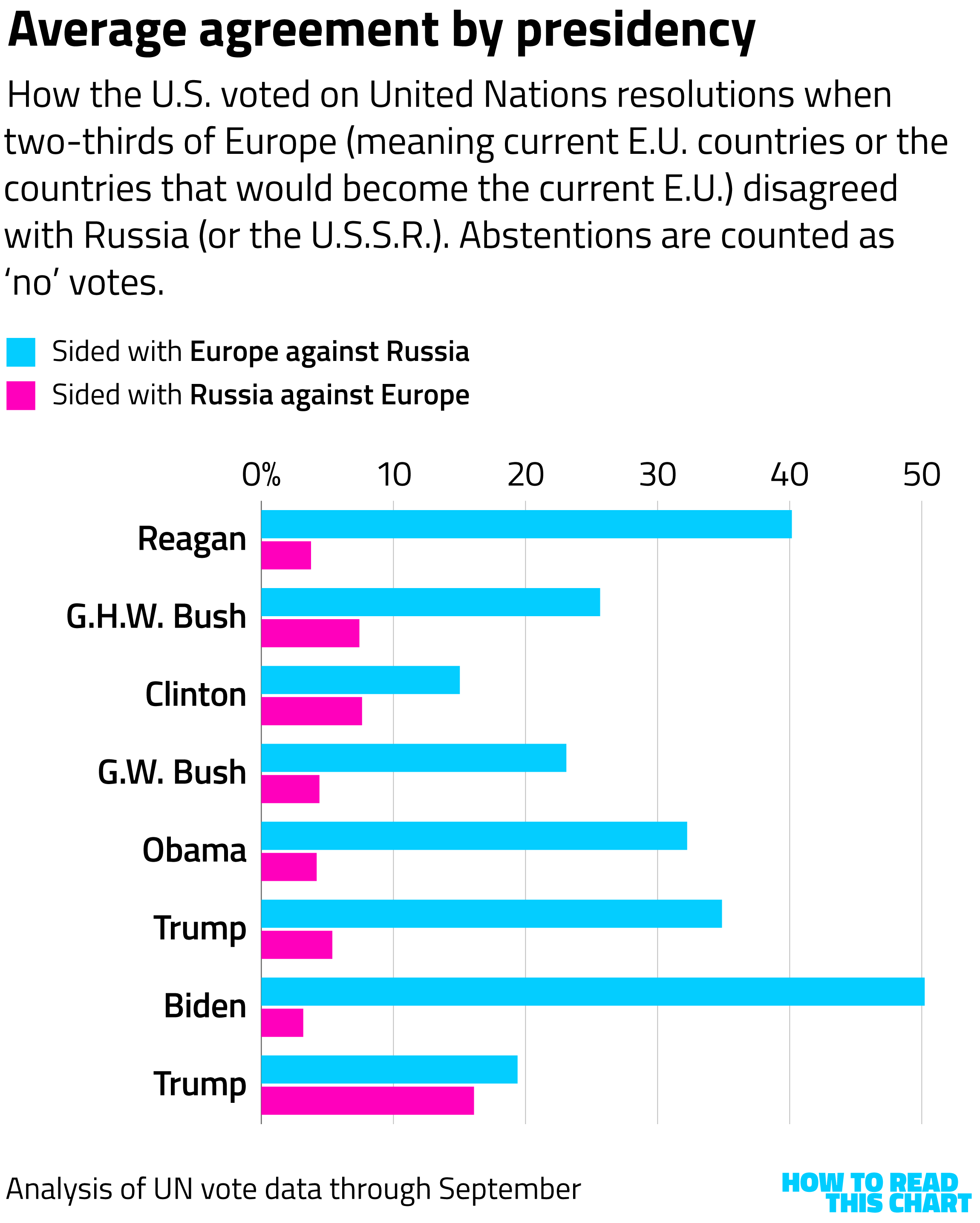 Philip Bump offers a chart based on UN vote data to show US support for Russia or for Europe from the Reagan presidency through the Trump presidency.