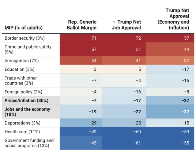 Voters who say the economy or inflation are their #1 issue are D+12 in the generic ballot, and give Trump a net job approval rating of -20G. Elliott Morris (Strength In Numbers)