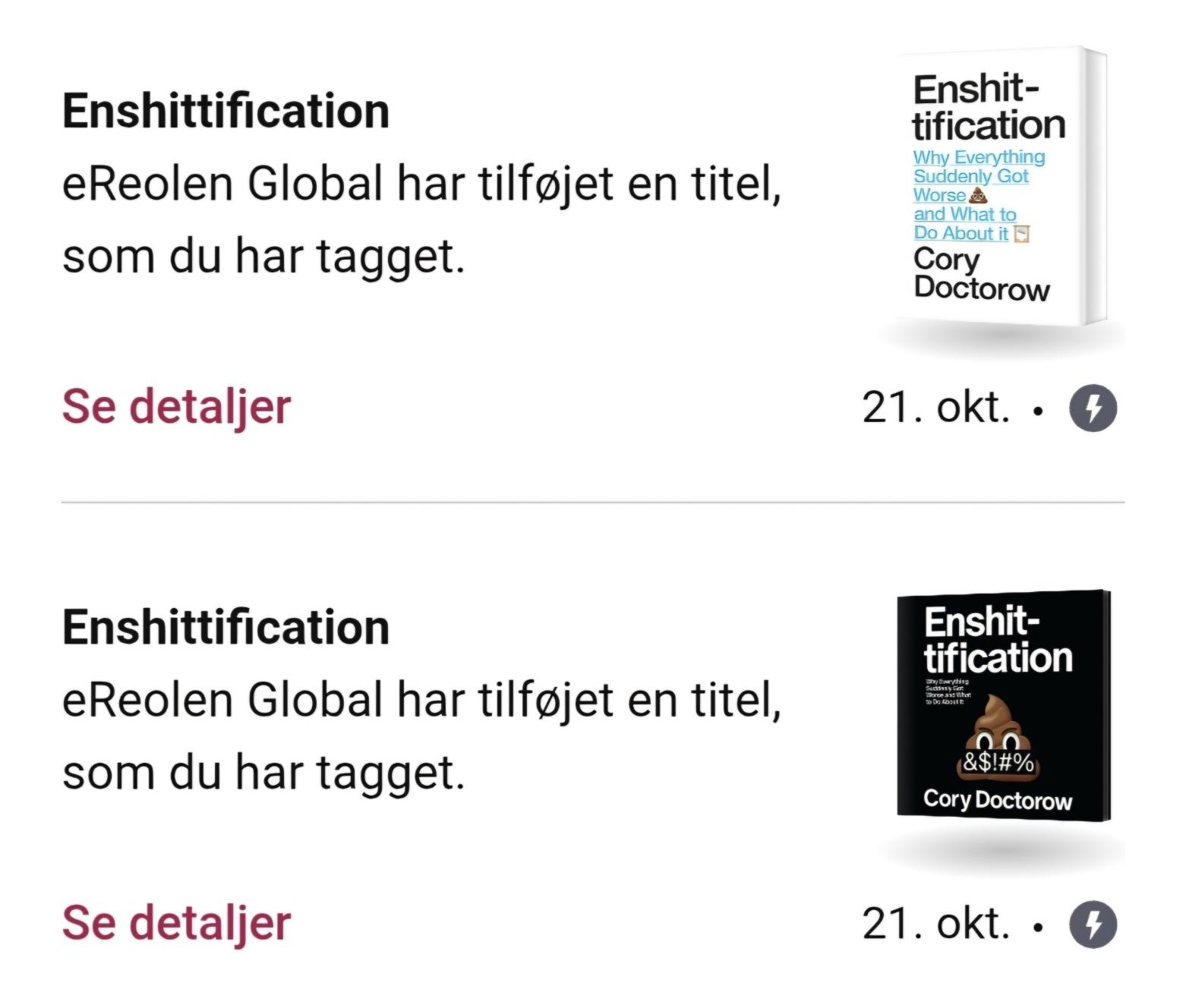 In September, I put in a purchase request for Enshittification at the library. In October, I was notified that Aarhus library now has it in stock. I reserved the audiobook. I just got a notification that it's ready for me to borrow. In one click, I have borrowed it. The library's simple, free, reader-oriented process is like the opposite of enshittification.