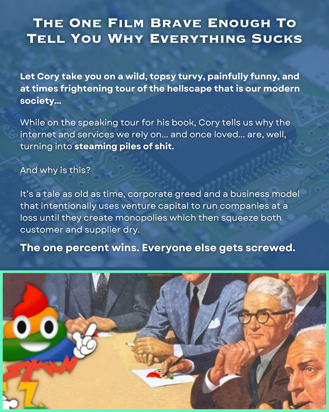 We’ll be there as Cory dives in headfirst to confront the Enshittocene. It’s not for the faint of heart, but it’ll be entertaining!