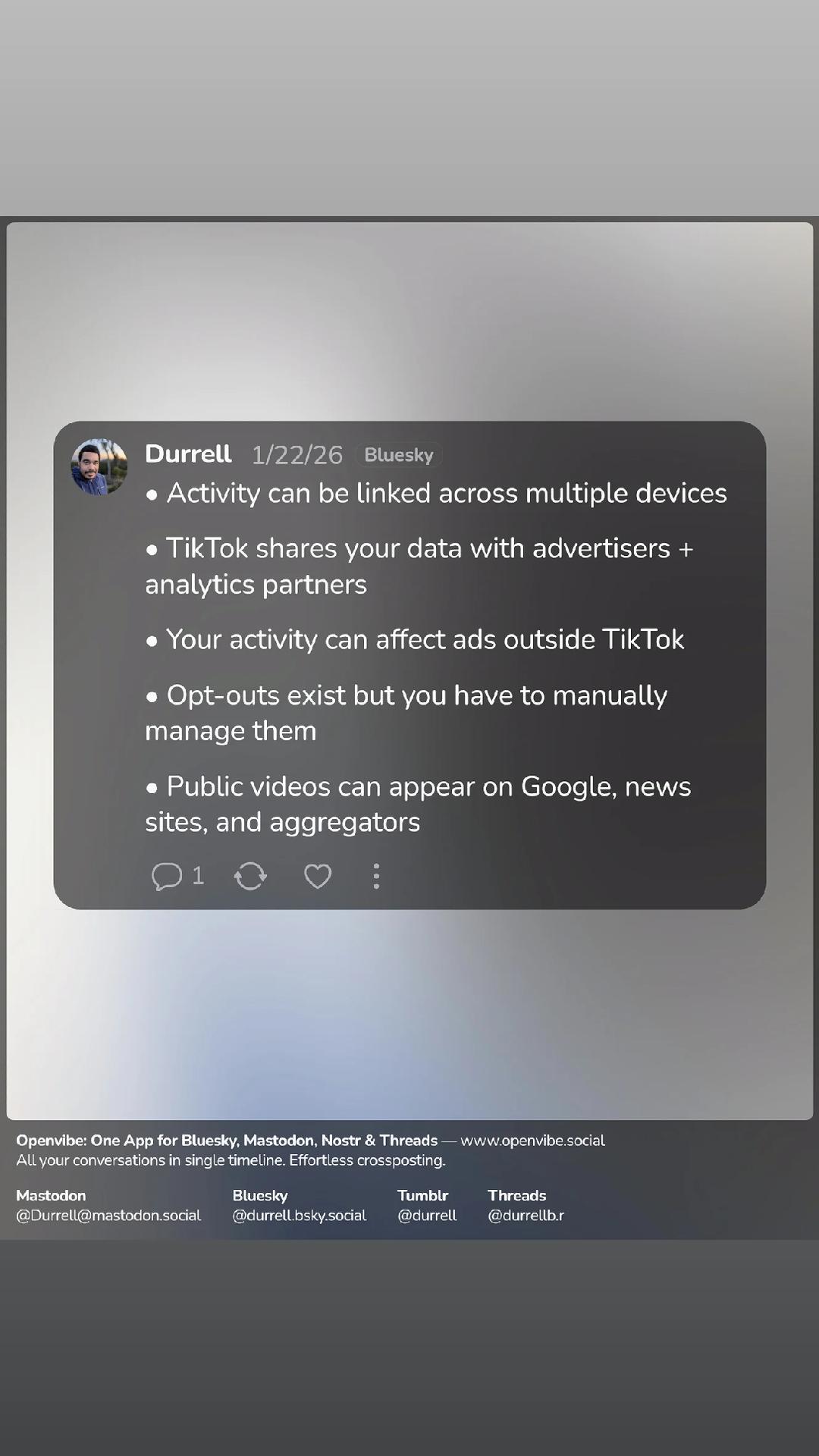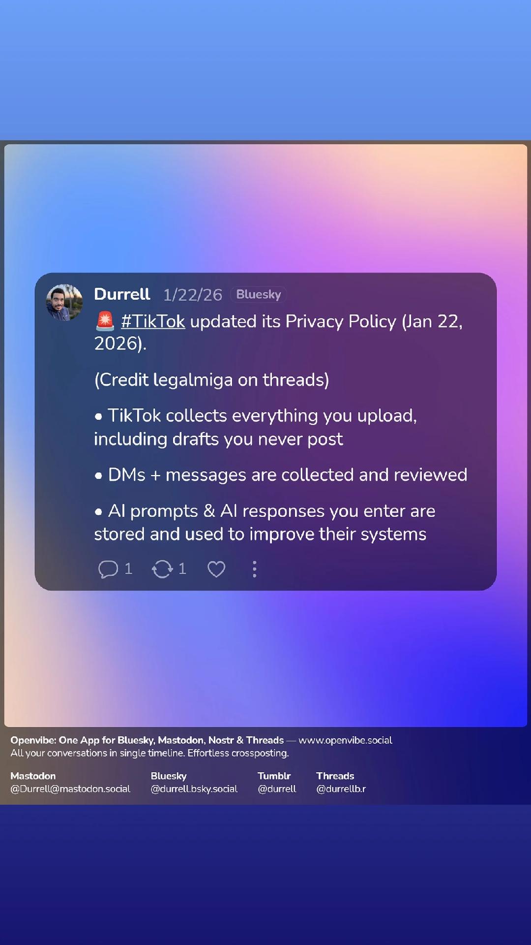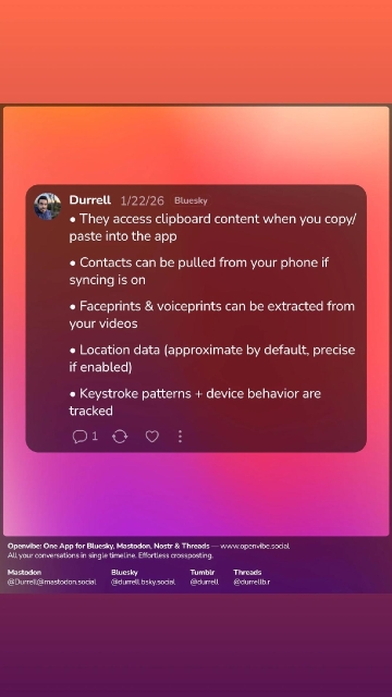 Attached: 1 image I'm not on the tiktok but if you are, delete it. New ToS gives permission for it to track citizenship status, religious beliefs, mental health diagnosis, sexual orientation and if you're trans. It's a surveillance tool.The Speakeasy at Bardic Perspiration