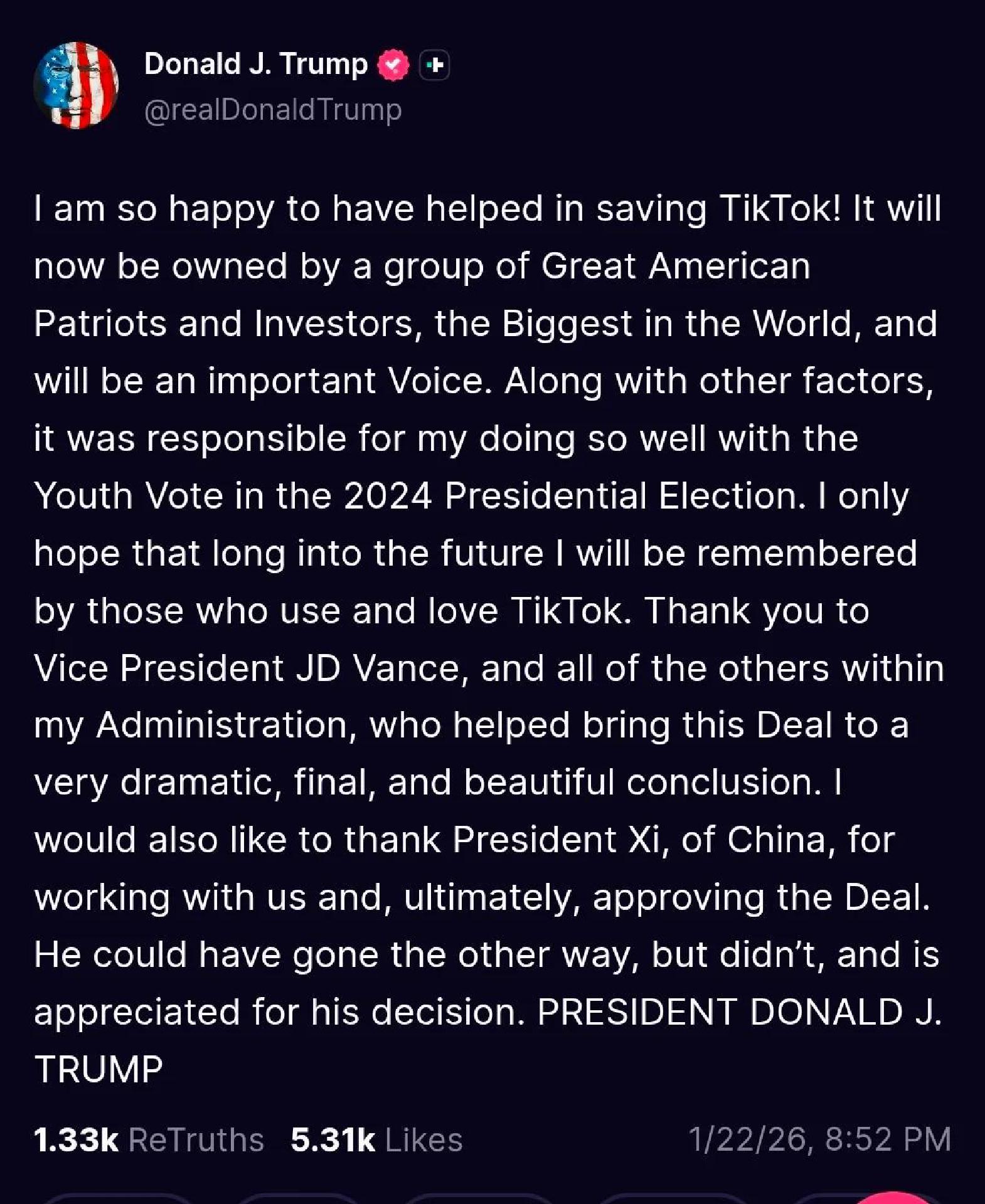 TikTok announced a long-awaited deal for a majority American-owned joint venture it said “will operate under defined safeguards that protect national security."Jill Goldsmith (Deadline)