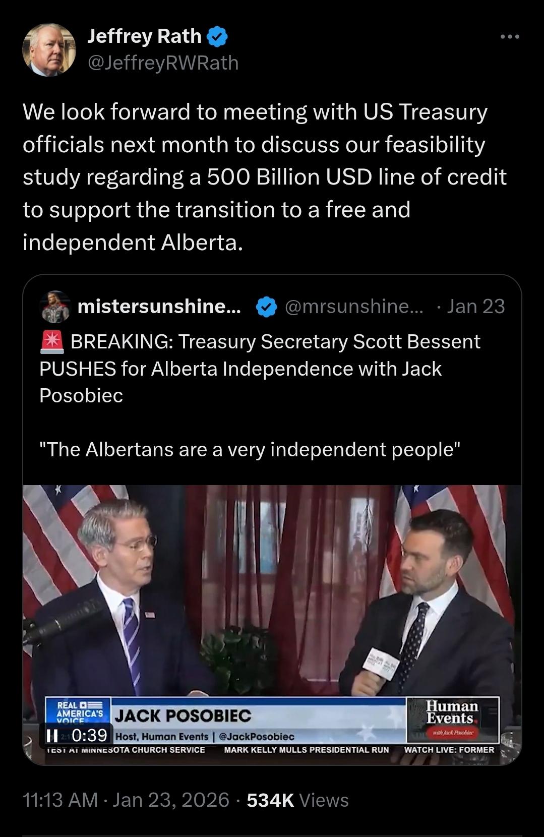 Alberta Separatists are trying to sell Alberta to the US, while Trump makes threats to annex Canada, Greenland, and Venezuela.